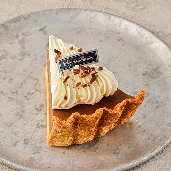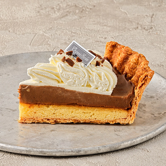 サクサクのパイ生地にアーモンドクリーム、チョコカスタードが濃厚でおいしい!柑橘ジュレがアクセントです。