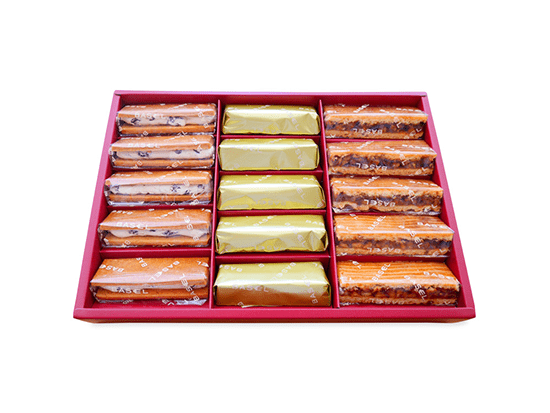 包装された15個入りのお箱に、ガトー・オ・ノア、レーズンサンド、レ・フィーユが5個ずつ入ったギフト。